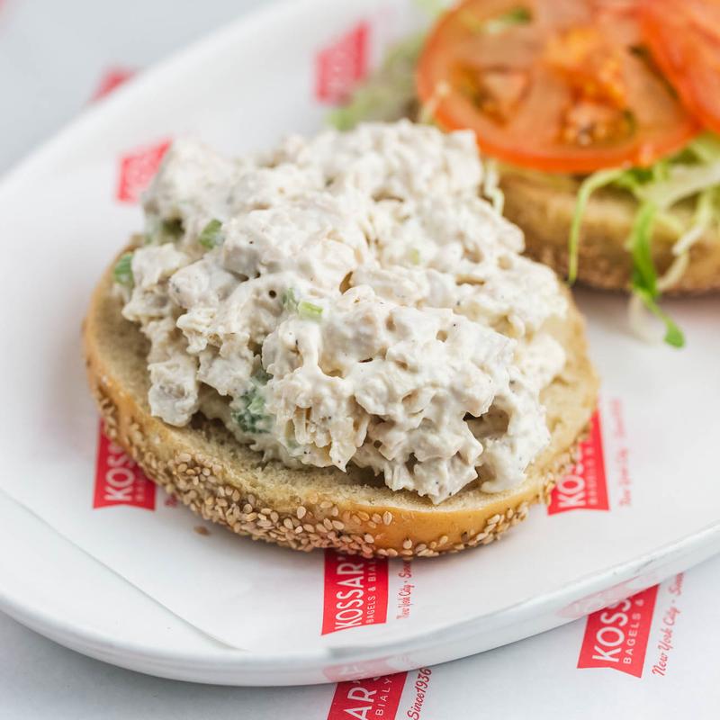 Homemade chicken salad served with lettuce, tomatoes, cucumber, red onion, and your choice of bagel.