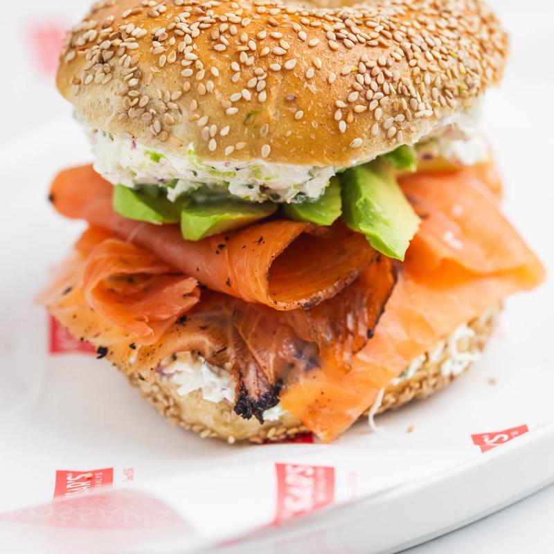 Pastrami-cured Nova, avocado, cucumber, and double onion cream cheese.